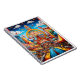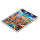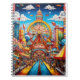 vibrant and colourful amusement park scene. At the centre, there’s a large Ferris wheel with the word “SKYLANE” on it. Surrounding the Ferris wheel are various whimsical structures, including towers and tents with flags. The sky is filled with hot air balloons and fluffy clouds. A bustling crowd of visitors is seen on the pathways, enjoying the festive environment. The overall atmosphere is one of excitement and fun, typical of a fairground or theme park.
