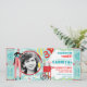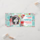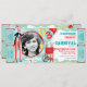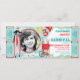Stilt walkers, cotton candy, and balloons carnival theme birthday card with photo insert in blues, red, white, and yellow with raffle tickets at side. Just perforate the sides for an easy tear off!