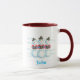 Three caroling snowmen in the snow, on personalised Christmas mugs. The name is written in blue and is topped with snow. Be sure to update the name on both sides. Thank you for shopping at CherylsArt on Zazzle.