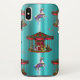 A retro, carnival themed iPhone X case featuring a lovely pattern of vintage carousel horses and merry go rounds, all set on a colourful blue background.