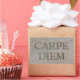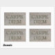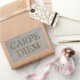 * graphic: captures the look of letters chiseled into stone. saying (ancient Roman/Latin) meaning: Seize the Day, enjoy the moment, don't waste time