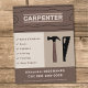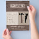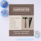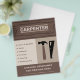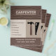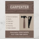 A flyer with the text Carpenter written on a wooden background, and on the left, an illustration of a hammer and a saw, all in beige tones. Also including contact details and a full list of services. Perfect for woodworking professional such as carpenter, cabinetmaker, wooden construction, etc.