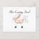 The pregnant mum to be and dad to be will love this cute maternity design T-shirt, tote bag, buttons, and other pregnancy items with a pink carriage and text that reads "She's Coming Soon!".