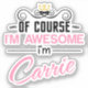 Of Course I'm Awesome I'm Carrie in mixed black and pink sans and decorative cursive font lettering with scroll embellishments and topped a golden crown.