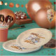 Rustic textured paper plate with a BBQ and Beers party theme for celebrating 50th birthdays, with two cartoon characters by the grill and drinking beer straight from the barrel. The years 50 can be changed to suit for example 40th or 60th birthdays.