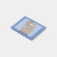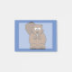 A buggy eyed super cute brown beaver on a blue background that reminds you of the watery ponds beavers like to live in.