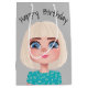 Cute cartoon girl with blonde hair and big eyes on a grey background and Happy Birthday text.