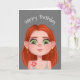 Cute cartoon girl with red hair and large green eyes on a grey background with Happy Birthday text.