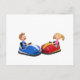 Cartoon boy and girl in bumper cars at an amusement park ready to have fun!