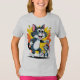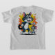 Fun cartoon T-shirt design featuring a playful cat chasing a mouse with cheese. Bright colours, comic explosion background, and dynamic art style make it perfect for casual wear.