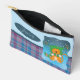 A fun pouch to help your kid keep their pens and pencils organised . It features a cartoon ginger cat standing in the snow in the front and a blue and purple plaid pattern in the back . Personalise it with a name .