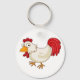 This design is a cartoon chicken. The chicken is white with red tail and is standing side on. Thie chicken is in a cartoon style. This cartoon chicken design looks great on this Keychain