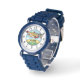 This personalized kids' watch features a bright yellow and red cartoon firefighting seaplane soaring over a cheerful forest of smiling trees within a striking circular badge.
