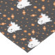 A cute Halloween table runner with the pattern of a little cartoon ghost trick-or-treater , tiny jack-o-lanterns and orange candies .