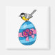 An illustration of a cute cartoon great tit bird on a blue stripes color Easter egg with pink ribbon and violet flowers. This design is a gift idea for easter egg hunting lovers, spring season lovers and chickadee or cinciallegra bird lovers.