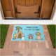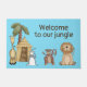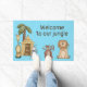 Humourous front door mat with a jungle theme done in sky blue, with cartoon graphics of a grass hut with palm tree, giraffe, lemur, monkey and a lion. Welcome to our jungle in brown text can be personalised to read what you want.