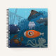 This cute notebook features illustration of brave kid exploring underwater life from the window of his submarine. He travels among the corals and ship wrecks watching various sea creatures such as octopus, shark, crab, jellyfish. Design is done in blue tones. Ideal notebook for the kid who dreams about adventure and interested in sea life.
