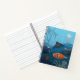 This cute notebook features illustration of brave kid exploring underwater life from the window of his submarine. He travels among the corals and ship wrecks watching various sea creatures such as octopus, shark, crab, jellyfish. Design is done in blue tones. Ideal notebook for the kid who dreams about adventure and interested in sea life.
