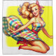 This shower curtain has a cartoon lady on it.