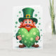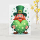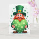 This card shows a cheerful leprechaun centered on a bright white background, smiling straight ahead with an inviting, friendly look 💚. He wears an emerald green outfit with a tall top hat topped by a gold buckle, and his orange-red beard fans out around rosy cheeks. In his gloved hands he holds a huge light-green heart covered in pale green polka dots, like a sweet token meant for a close friend. His big green eyes sparkle, and the gentle curve of his grin makes the scene feel like a warm hello shared between two people. The greeting text sits above him in green, with a smaller line below in lighter green that balances the layout ☘️. Soft light gives his rounded face and outfit subtle shading, while his sturdy brown boots show tiny stitched details near the soles. Small four-leaf clover shapes drift around him in the open white space like little accents floating near the corners.