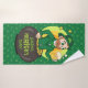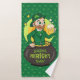Bath Towel with an Illustration of a smiling leprechaun wearing a green suit, a bow-tie, and a bowler hat while sitting inside a pot o’ gold and holding a pint of beer, with yellow, green, and orange rainbow in the background. The image is placed over a seamless dark green background with shamrocks.
