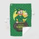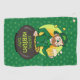 Golf Towel with an Illustration of a smiling leprechaun wearing a green suit, a bow-tie, and a bowler hat while sitting inside a pot o’ gold and holding a pint of beer, with yellow, green, and orange rainbow in the background. The image is placed over a seamless dark green background with shamrocks.