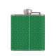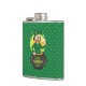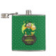 Flask with an Illustration of a smiling leprechaun wearing a green suit, a bow-tie, and a bowler hat while sitting inside a pot o’ gold and holding a pint of beer, with yellow, green, and orange rainbow in the background. The image is placed over a seamless dark green background with shamrocks.