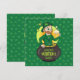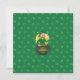 Cartoon leprechaun in a pot of gold holding a pint invitation