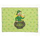 Pillow case with an Illustration of a smiling leprechaun wearing a green suit, a bow-tie, and a bowler hat while sitting inside a pot o’ gold and holding a pint of beer, with yellow, green, and orange rainbow in the background. The image is placed over a seamless light green background with shamrocks.