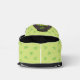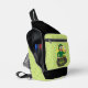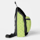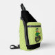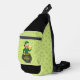 Sling bag with an Illustration of a smiling leprechaun wearing a green suit, a bow-tie, and a bowler hat while sitting inside a pot o’ gold and holding a pint of beer, with yellow, green, and orange rainbow in the background. The image is placed over a seamless light green background with shamrocks.