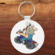 This design is a cartoon man on a motorcycle. The man is riding off looking behind him. He has a red love heart tattoo on his arm. This cartoon man on a motorcycle design looks great on this Keychain