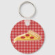 Cute cartoon illustration of a greasy slice of pizza with three pieces of salami and a lot of cheese on top of it. The background colour is red with white plaid pattern.