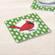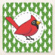Cartoon Red Cardinal on Green White Pines Pattern Square Paper Coaster