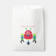 Cute birthday party favour bags with a colourful cartoon robot done in red, green, blue, and yellow. Personalise the dotted red text for your son's birthday. Matching invitations and party supplies are available.