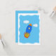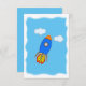 Custom greeting card with cartoon rocket and clouds with newsprint effect on blue background.