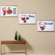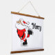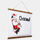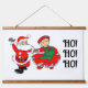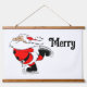 Three fun Santa illustrations. The first panel has Mr. & Mrs. Claus skipping along holding hands with the words "Ho! Ho! Ho!" written in a festive typeface. The second panel is Santa skating merrily along with the words "Merry" trailing behind him in the same font. The third panel has a drawing of Santa holding his hat and cane and dancing his heart out. All panels have snow white backgrounds.