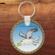 Cartoon seagull flying over head with a gold frame key ring