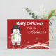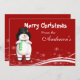 Funny looking cartoon Frosty the Snowman on a red snowy background. Very cute and fun Christmas greeting card invitation.