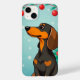 Cartoon-style dachshund sitting in a wintery scene. The dog has a predominantly black coat with distinctive brown markings on its ears, face, and paws. It has a proud and curious expression, with its head turned slightly to the side. In the background, there are decorative red Christmas ornaments hanging from branches, alongside a green tree that suggests a festive holiday atmosphere.