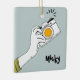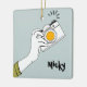 Cartoon style hand clicking a camera, ceramic Ornament. cartoon style on a dusty green background.