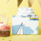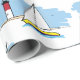 This fun design features a cartoon-style drawing of a sailboat on water near land and a red-and-white lighthouse backed by a light-blue sky.