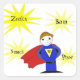 A fun design featuring a cartoon super hero in a blue suit, a red cape and black shoes. Fun super hero words around him... change as desired.