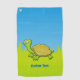 Cartoon illustration of a happy turtle on grass and sky background. Custom text.