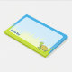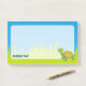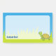 Cartoon illustration of a happy turtle on grass and sky background. Custom text.