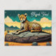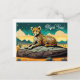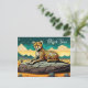A wild cartoon style leopard lies on a rock at desert postcard.