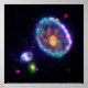 Approximately 100 million years ago, a smaller galaxy (perhaps one of those to the left of the Cartwheel) plunged through the heart of Cartwheel galaxy, creating ripples of brief star formation.