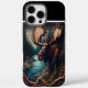 A lifelike bull moose art work, complete with imposing antlers, stands in a forest beside a flowing stream. The intricate carving features realistic textures and painted details
