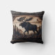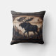 A detailed wood carving of a moose walking through a forest, surrounded by mountains and trees, showcasing artistic craftsmanship.