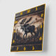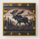 A detailed wood carving of a moose walking through a forest, surrounded by mountains and trees, showcasing artistic craftsmanship.