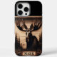 A detailed wood carving of a moose with large antlers, set against a backdrop of forest trees. The carving is on a wooden plaque with the name Mark inscribed in the lower centre.